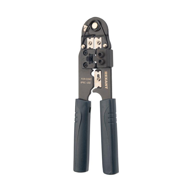• НАЗНАЧЕНИЕ Инструмент предназначен для обжима разъемов RJ-45 (8P8C и 10P10C), RJ-12 (6P6C), RJ-11 (6P4C и 6P2C) и RJ-10 (4P4C) в зависимости от модели инструмента, обеспечивает высокое качество соединений, производительность и культуру монтажа. • ОБЛАСТЬ ПРИМЕНЕНИЯ Прокладка информационных сетей на основе проводов типа «витая пара», подключение телефонных аппаратов, компьютеров и сетевого оборудования. • ПРИНЦИП ДЕЙСТВИЯ Жилы провода «витая пара» раскладывается в пазах разъема RJ согласно схеме соединений без съема изоляции, разъем помещается в соответствующий паз инструмента и обжимается. При этом матрица клещей проталкивает жилы проводов в зону ножей разъема, ножи прорезают тело жил и обеспечивают устойчивое электрическое и механическое соединение. При окончании цикла вдавливания режущие кромки инструмента обрезают выступающие концы жил. • ДОПОЛНИТЕЛЬНЫЕ ПРИНАДЛЕЖНОСТИ И АКСЕССУАРЫ не требуются