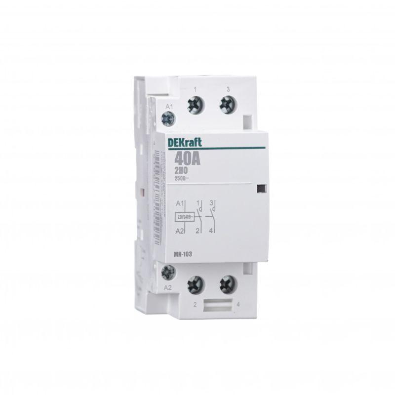 Модульный контактор серии МК-103 DEKraft; ном.ток 40 А (АС-7а); кол-во и исполнение контактов – 2НО; напряжение управления 220 В пер.тока; ширина – 2 мод. х 18 мм; установка – на DIN-рейку. Контакторы МК-103 применяются в сетях напряжением до 400 В пер.тока для дистанционного управления небольшими нагрузками, требующими большого количества включений / отключений, например, насосы, системы вентиляции и т.п. Модульные контакторы не требуют дополнительных настроек и специального обслуживания.