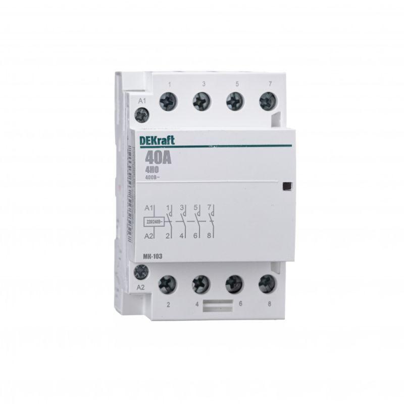 Модульный контактор серии МК-103 DEKraft; ном.ток 40 А (АС-7а); кол-во и исполнение контактов – 4НО; напряжение управления 220 В пер.тока; ширина – 3 мод. х 18 мм; установка – на DIN-рейку. Контакторы МК-103 применяются в сетях напряжением до 400 В пер.тока для дистанционного управления небольшими нагрузками, требующими большого количества включений / отключений, например, насосы, системы вентиляции и т.п. Модульные контакторы не требуют дополнительных настроек и специального обслуживания.