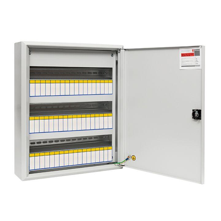 Навесной, с дверцей и замком. Изготовлен из металлического сплава, серого цвета. Размеры: 480 х 120 х 400 мм. Защищен от проникновения пыли и вертикальных капель (IP31).