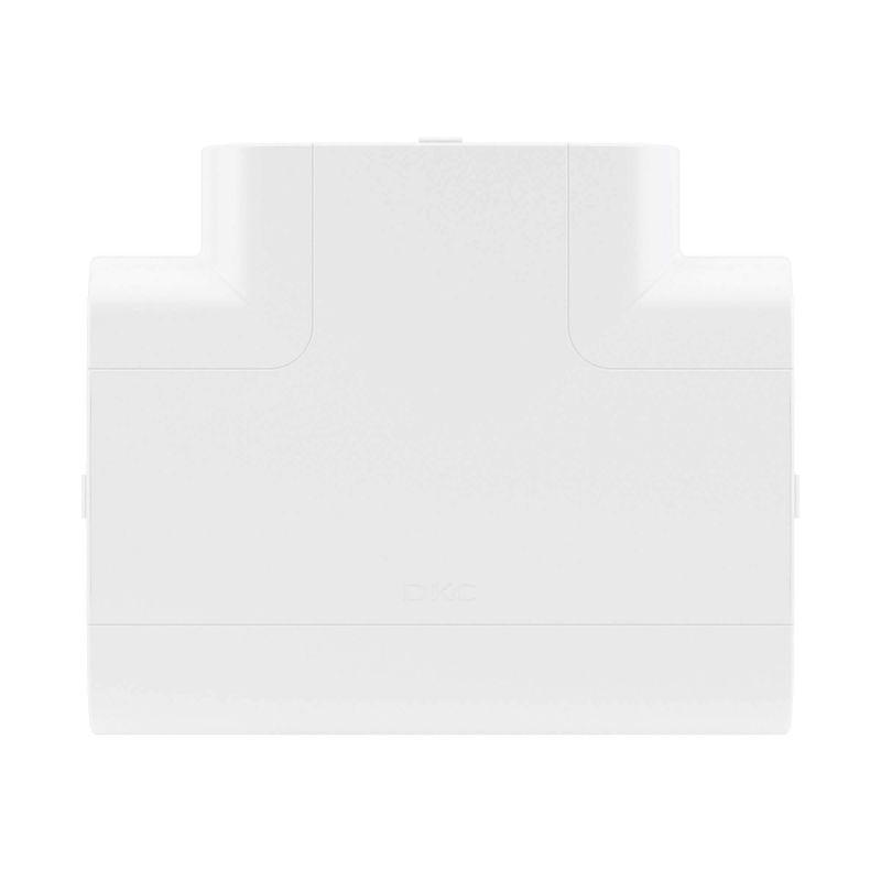 Тройник (Т-образный отвод). Назначение: декоративное оформление мест Т-образного соединения кабельных коробов. Характеристики: материал накладки – АБС-пластик; материал базы и разделителей – ПП. Комплект поставки: внешняя декоративная накладка; внутренняя база с разделителем. Типоразмер 110х50. Цвет белый